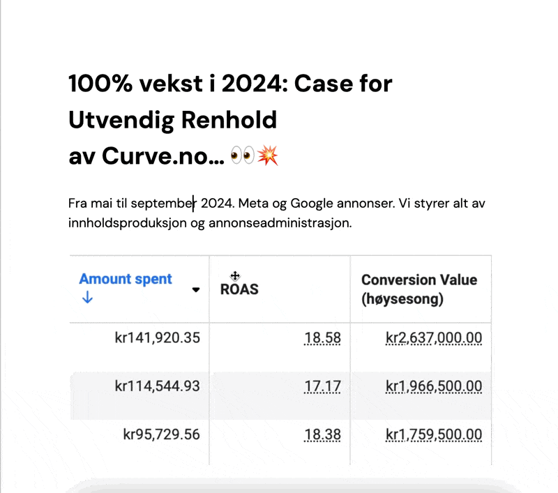 Fra mai 2024 til september 2024 har vi skapt 100% vekst for Utvendig Renhold med betalt annonsering.